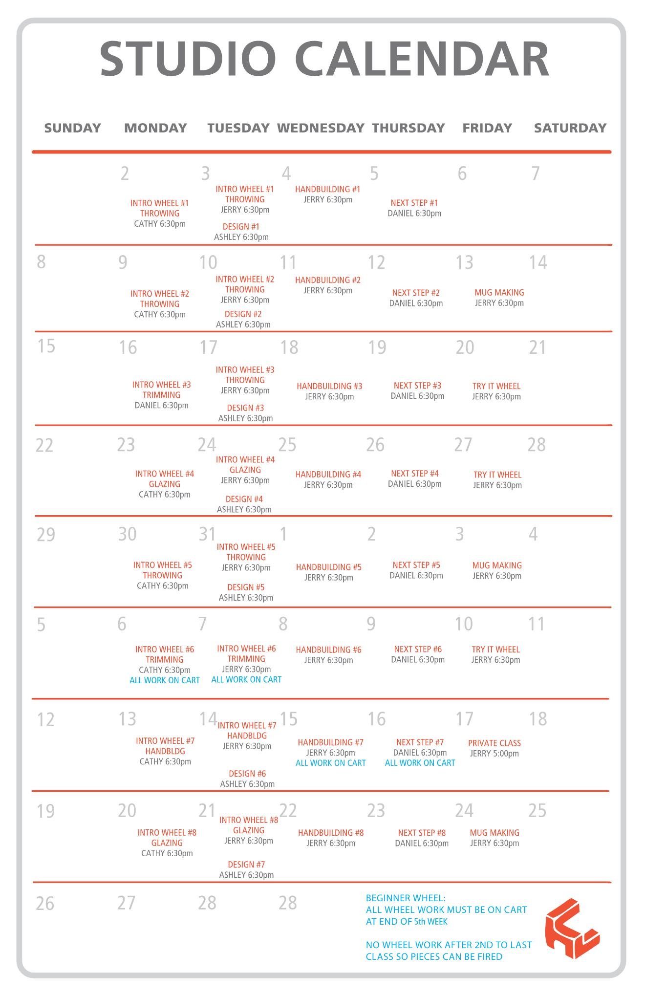 The studio calendar is updated regularly to include upcoming classes and workshops.