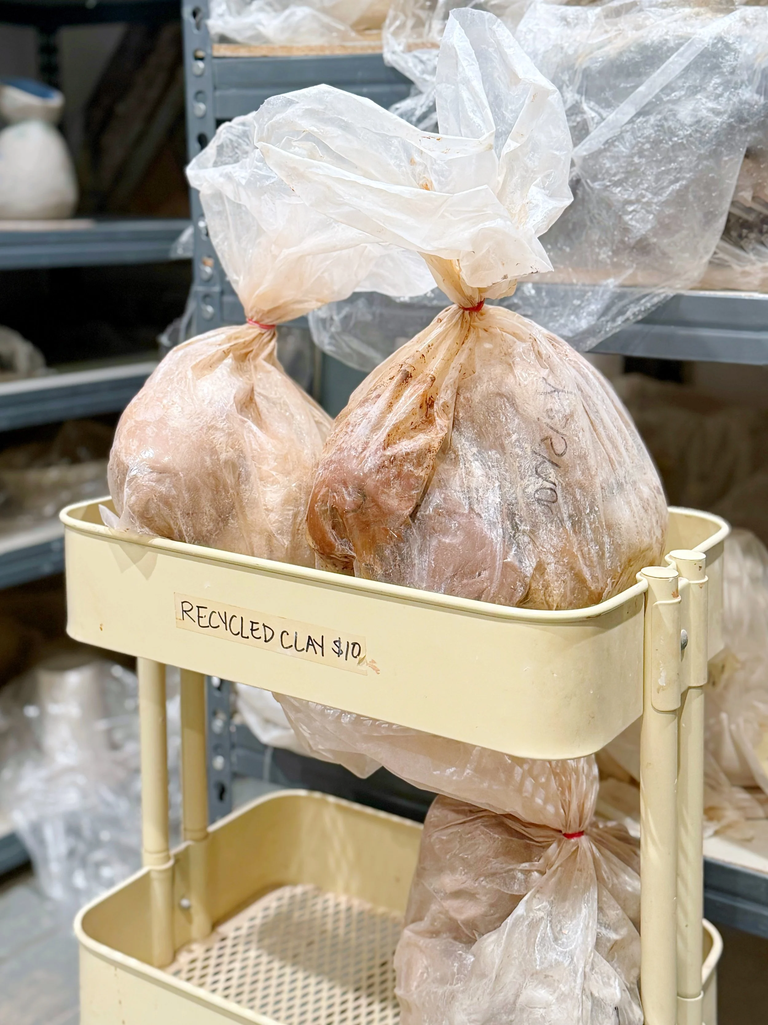 In-progress work is stored in the Damp Room, a 200 square foot room lined with shelving and kept at a high humidity. Greenware dries at a predictable rate and members are free to explore work of any size. Unclaimed bone-dry pieces are purged the first day of every month.